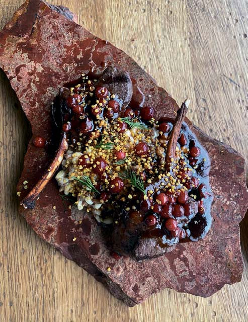 На кашу выложить каре оленя, полить соусом, декорировать укропом и ягодами.
