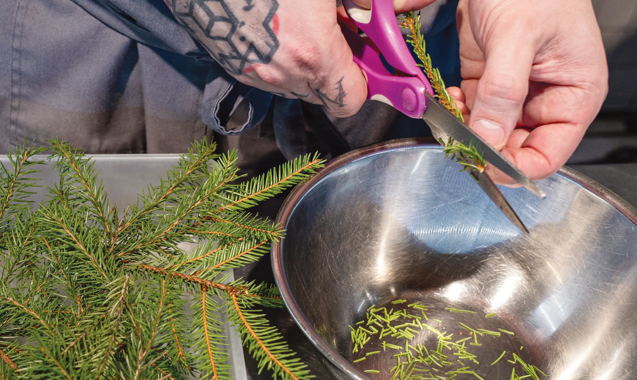 Все началось с ели — восемь лет назад я попробовал сделать из нее мороженое к десерту на новогодний ужин. Новый год и ель — выбор очевидный. Из иголок отжал масло, а жмых пошел на базу для мороженого. Оно до сих пор есть в меню hamlet + jacks и сервируется с миндальным фонданом.