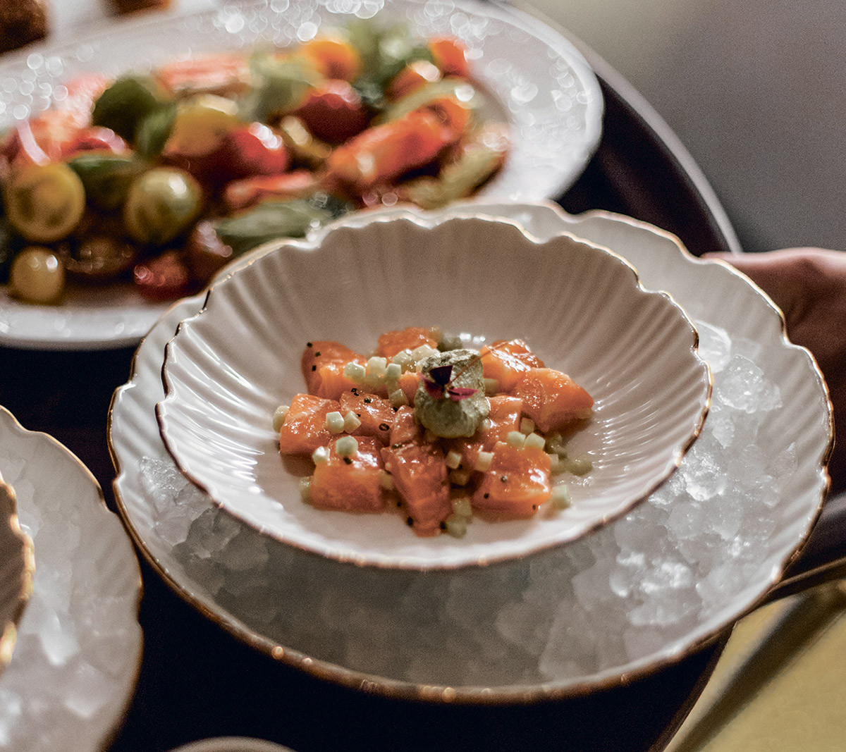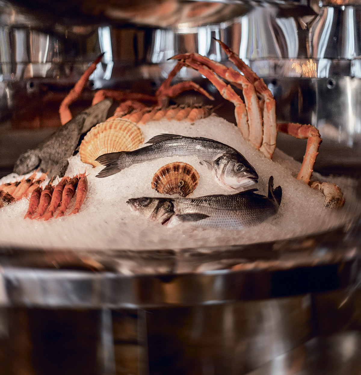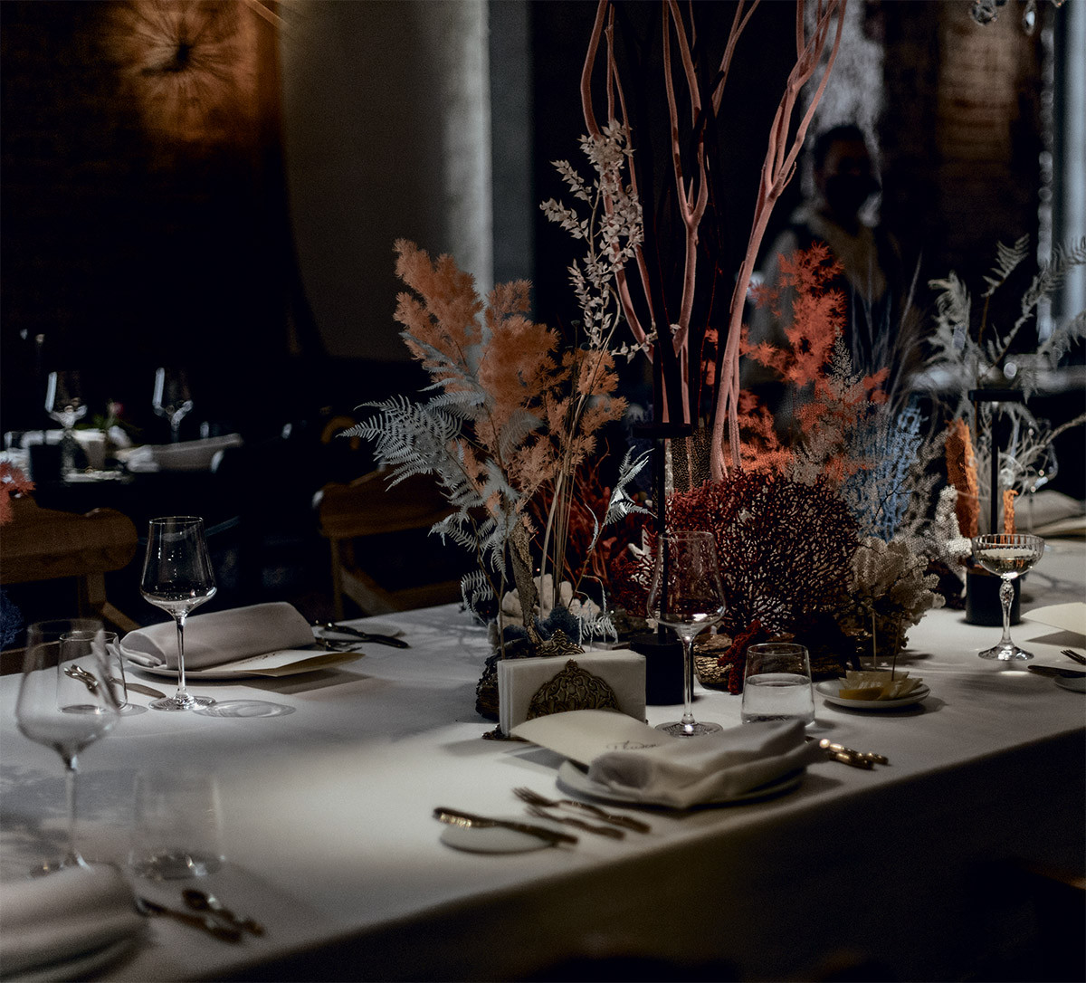 Кроме того, нам хотелось сделать ресторан, не похожий по еде на сегодняшние стандартные московские рестораны. Гости устали от этих одинаковых проектов с практически одинаковыми меню, одинаковыми вкусовыми сочетаниями, и мы решили максимально дифференцироваться. Поэтому, например, у нас идет крупная нарезка и вся еда сделана с оглядкой на голландские и французские натюрморты XVII–XVIII веков. В ресторане есть стол «Рог изобилия», на который мы выкладываем сезонные продукты, и он действительно выглядит как классический голландский натюрморт. Никаких рюшечек из соусов, а брутальная еда большими кусками.