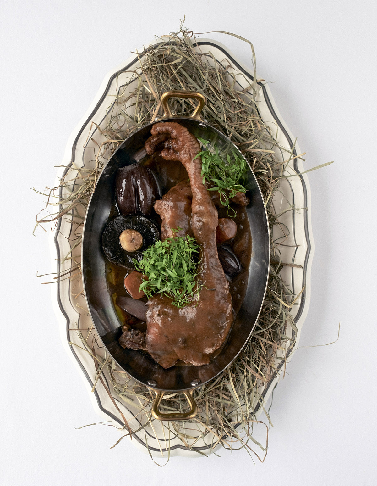 На тарелку выложить петуха в вине, рядом — шампиньоны и лук-шалот. Украсить кервелем.