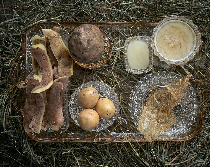 Картофель прогреть в соусе из картофельного сока 2 минуты. Соус вылить в центр глубокой тарелки, выложить картофель, полить глазурью из кожуры и посолить. Вокруг отцедить горячий картофельный мусс и накрыть хрустящим чипсом из картофеля.