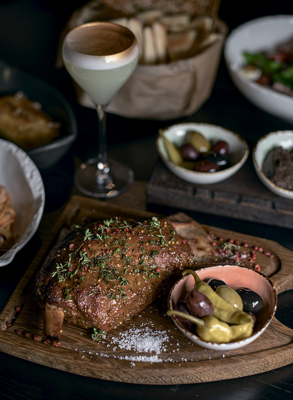 После варки вынуть лопатку из пакета, смазать медово-горчичным соусом и запечь в дровяной печи до появления золотистой корочки. Подавать с оливками, маслинами и маринованным золотым перцем.
