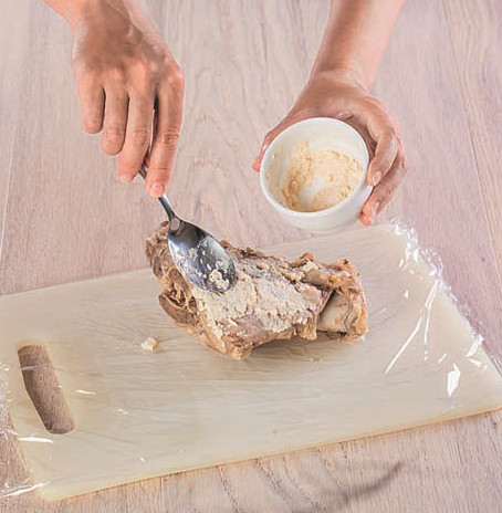 1. Свиную рульку залить водой и довести до кипения. Добавить лавровый лист, тмин и варить 1,5 часа. Чеснок нарубить и перемешать с хреном. Получившейся массой натереть рульку, завернуть в пленку и убрать в холод на 4 часа.