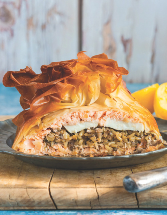 3. Тесто раскатать в пласт, немного отложить для украшения. По средней линии распределить половину рисовой начинки, сверху уложить рыбу, очищенные яйца и снова рисовую начинку. Края теста поднять и защипнуть, формируя пирог. Выложить на противень швом вниз. Из оставшегося теста сделать украшения. Прикрепить их на пирог. Смазать желтками и выпекать 30 минут при 200 °C.