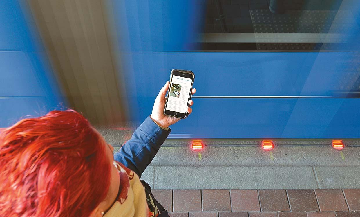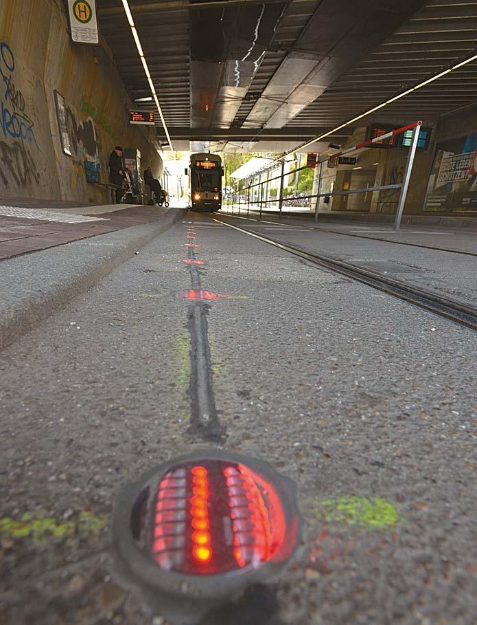 На одной из остановок в Аугсбурге светодиодные лампы на земле предупреждают пользователей смартфонов о приближении трамвая
