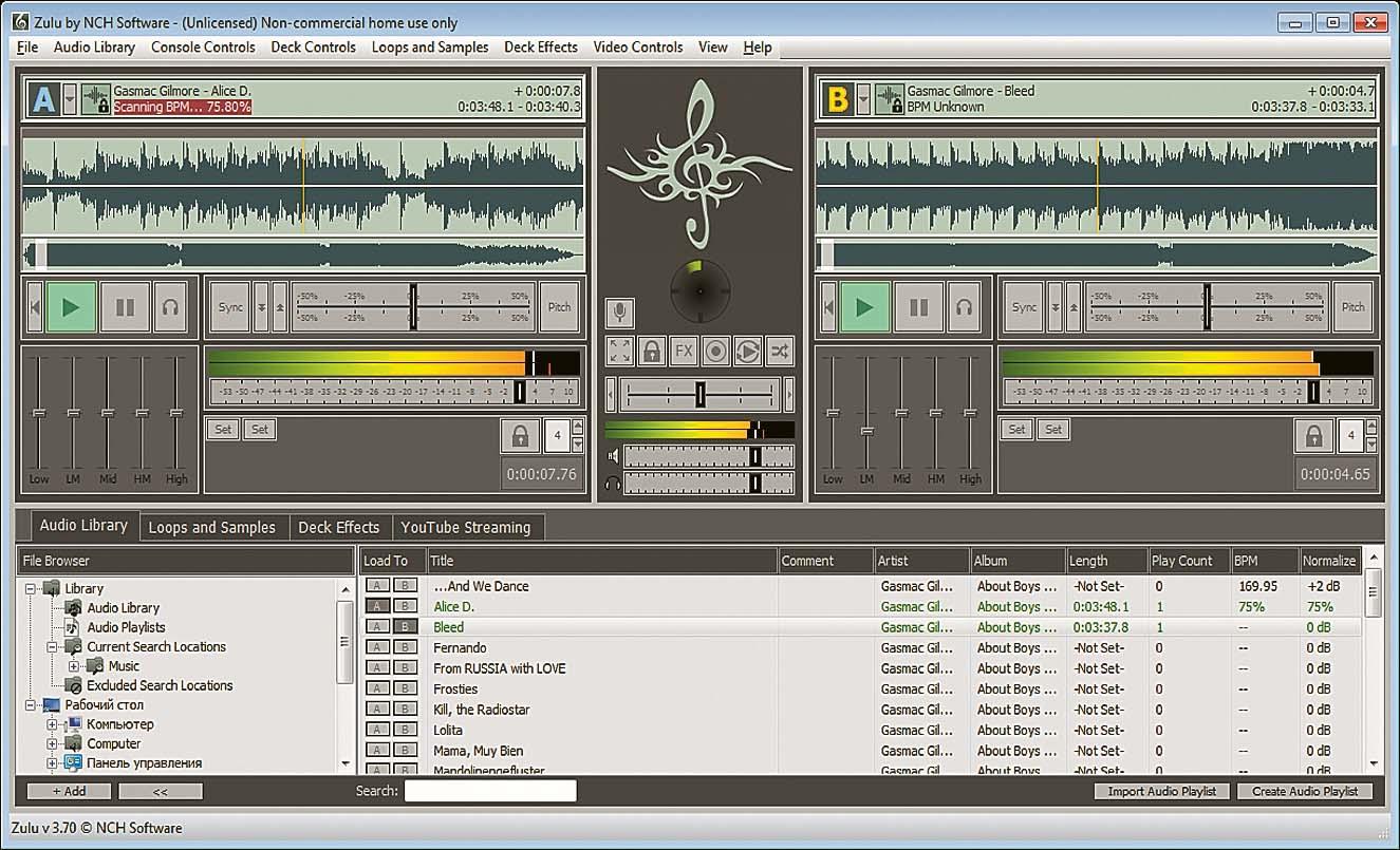 Программный диджейский микшер, создатели которого попытались превратить сведение треков в удобное и легкое занятие. С помощью этого пульта можно сводить треки вживую и применять эффекты «на лету». Полезные возможности программы — создание плавных переходов между треками, регулирование темпа, автоопределение ритма и автоматическая синхронизация ритмов сводимых треков, запись миксов в аудиофайлы.