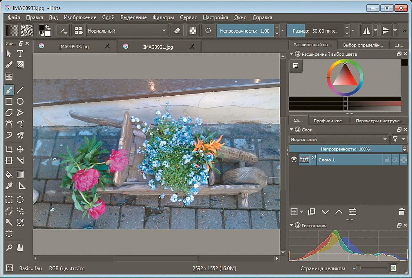 Растровый графический редактор, бесплатный и с открытым кодом. Проект развивается уже более десяти лет и за это время накопил немало весьма полезных наработок. Например, у Krita есть функция стабилизации линий, рисуемых кистью, модули создания собственных кистей, модули создания паттернов и текстур, всплывающие палитры и прочие удобные для художников вещи, ведь пакет в основном ориентирован на художников, самостоятельно рисующих новые изображения «с нуля». Поддерживаются цветовые модели RGB, CMYK и Lab, а также технология HDR. Посредством Krita можно работать одновременно над несколькими изображениями, открывая их в разных вкладках единого окна либо в разных окнах (настраивается пользователем). Вы можете делиться своими кистями на пользовательском подразделе сайта Krita, а также расширять свой инструментарий наработками, которыми делятся через сайт другие пользователи.