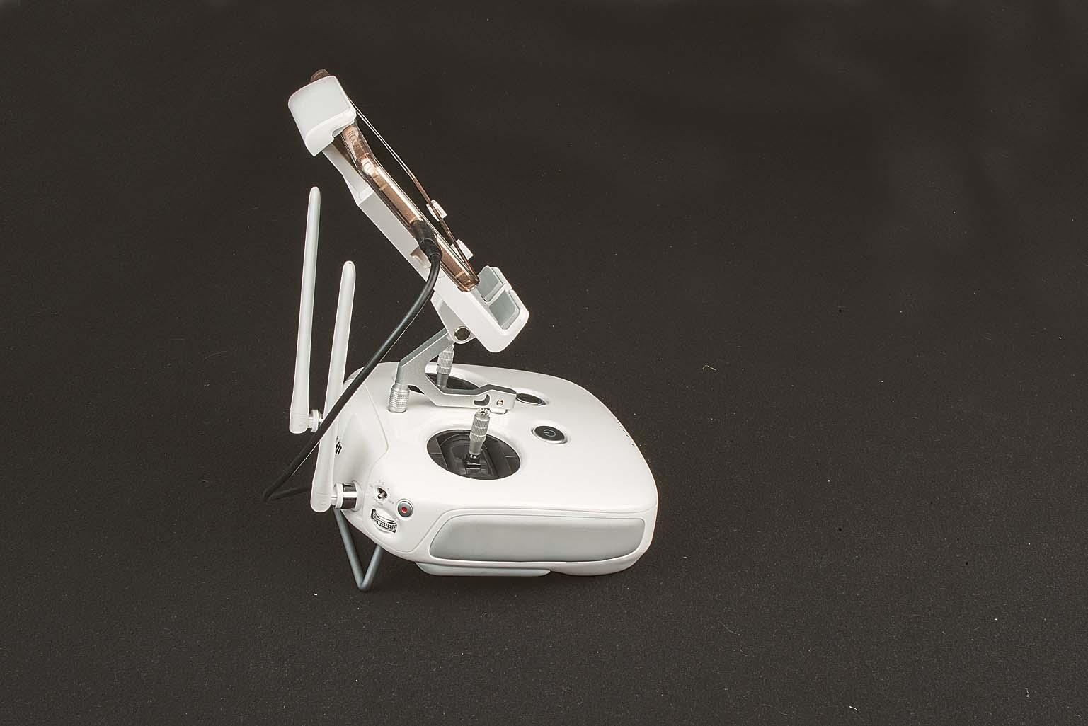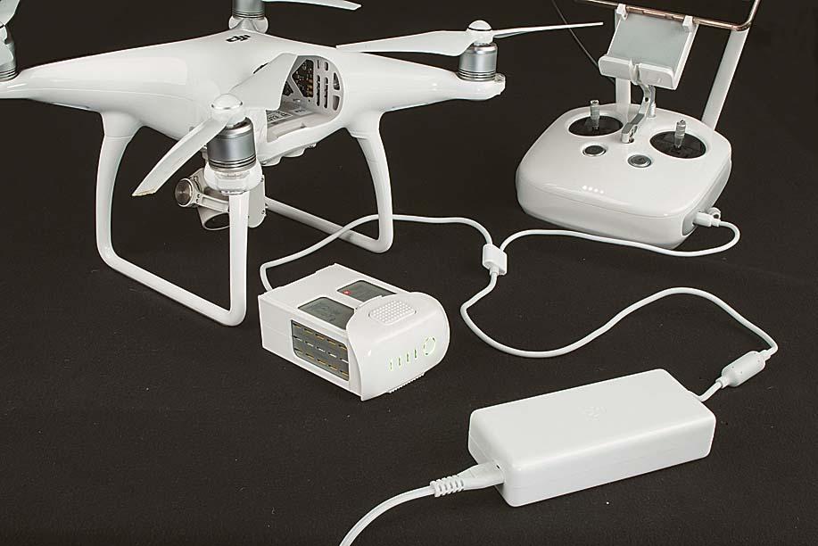 В пульт управления DJI Phantom 4 (1) вставляется смартфон или планшет. Приложение с возможностью изменения настроек передает изображение в режиме реального времени. Для зарядки аккумулятор и пульт подключаются к блоку питания DJI (2)