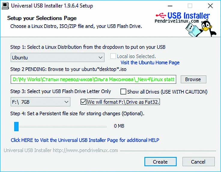 Ubuntu скачается на компьютер в виде файла в формате ISO, после чего его можно записать на USB-накопитель с помощью бесплатной программы — например, Universal USB Installer (goo.gl/dXQ9yw). Объем флешки должен составлять не менее 2 Гбайт. Настройте Universal USB Installer следующим образом: для «Step 1» выберите «Ubuntu», для «Step 2» через кнопку «Browse» перейдите к файлу ISO с Ubuntu, который необходимо записать на USB-накопитель, выберите его и нажмите «Открыть». Для «Step 3» необходимо выбрать из выпадающего меню USB-накопитель. Нажатие на «Create» запускает процесс записи. Учтите, что это действие безвозвратно удалит все данные, сохраненные ранее на флешке. Поэтому в этот момент вы увидите предупреждение, которое нужно закрыть кликом по кнопке «Да». Примерно через 3–5 минут USB-накопитель готов к использованию. Другой вариант — записать ISO-файл на DVD, но флешка быстрее и удобнее.