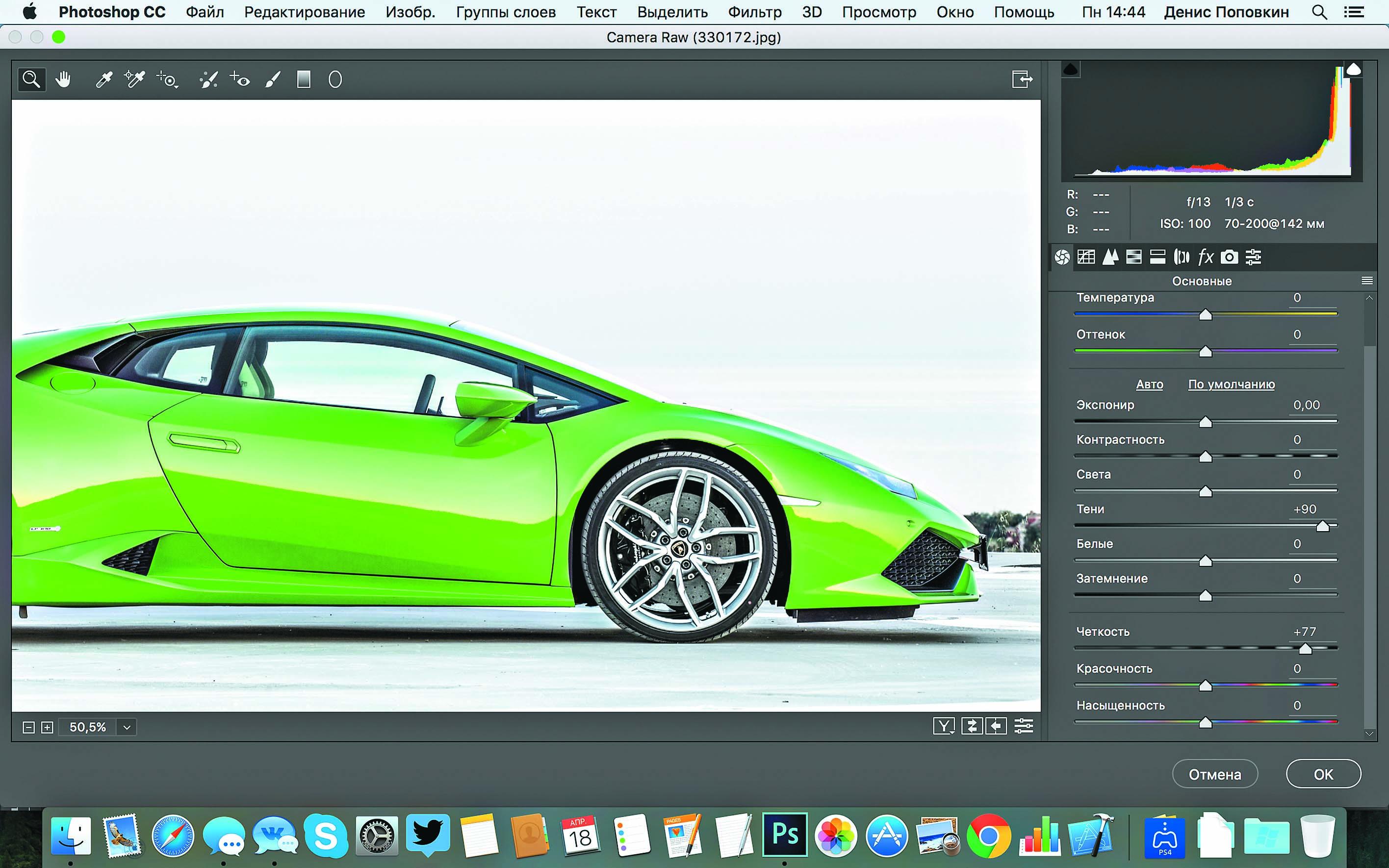 Увеличьте в программе Adobe Photoshop Lightroom или Camera Raw значения параметров «Тени» до «+90» и «Четкость» до «+77». Затем на закладке «Детализация» установите значение эффекта резкости «60» и «Маскирование» на «100», для того чтобы ограничить резкость на колесах и контурах Lamborghini. В завершение работы с деталями удалите незначительную хроматическую аберрацию в области колесных ниш, вызвав команду «Коррекция дисторсии | Цветность» и установив ползунок «Степень лилового» на значение «4».