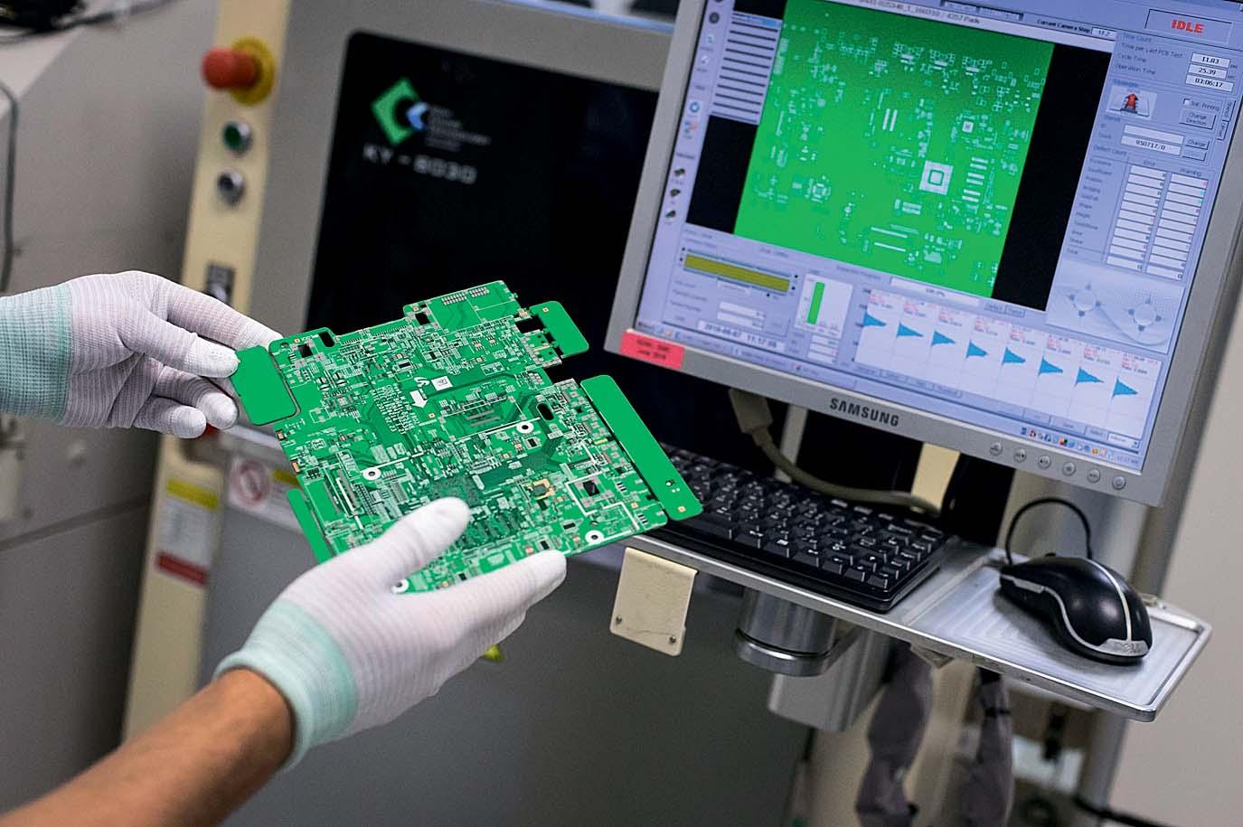 В цехе по производству печатных плат — как в больнице: все сотрудники здесь в белых халатах, шапочках и специальной обуви. А перед входом в цех нужно еще и обязательно пройти антистатическую обработку, чтобы в процессе сборки платы случайно не «убить» какой-нибудь электронный компонент статическим электричеством. На каждом этапе создания платы, в процессе пайки и закачки программного обеспечения проверяется ее работоспособность. Если плата не включается — это обнаружится на финальном функциональном тесте. На некоторых линиях могут производиться две модели плат для разных телевизоров в количестве около 200 плат в час (для каждой модели).