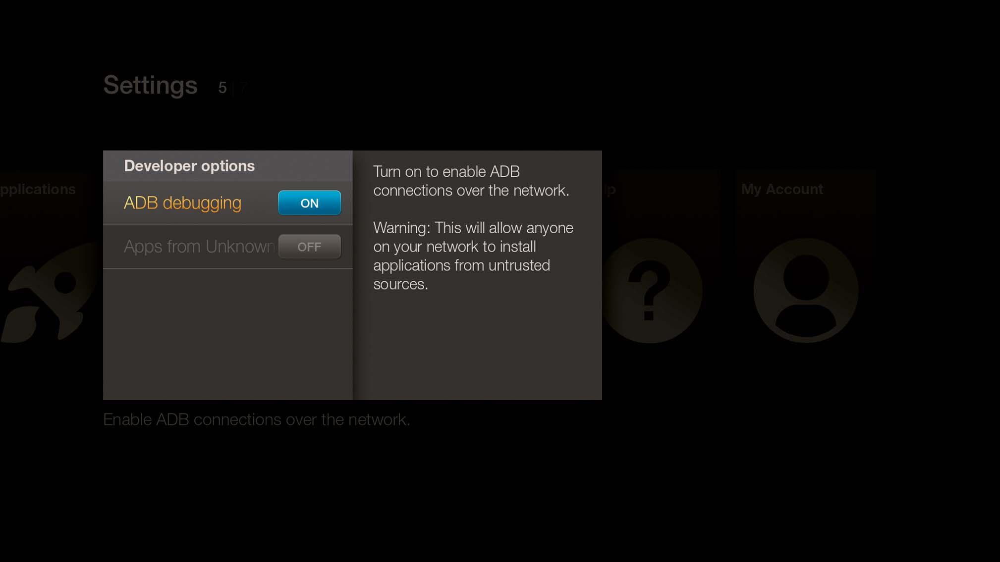 Прежде чем устанавливать приложения, необходимо активировать на ТВ-при ставке функцию приема ПО из других источников, отличных от встроенного магазина приложений. Для этого через «Settings | System | Developer Options» активируйте опции «ADB Debugging» и «Apps from Unknown Sources». Теперь перейдите к «Settings | System | About | Network» и запишите указанный там IP-адрес.