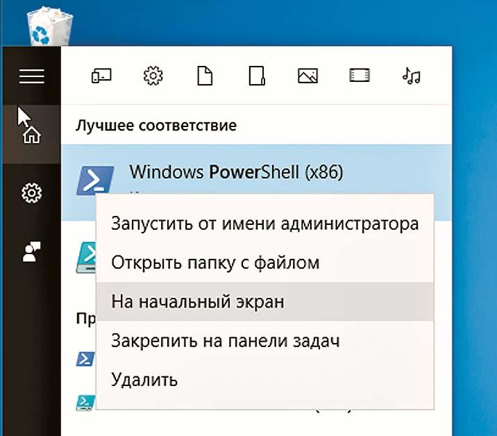 Для более быстрого запуска PowerShell в последующие разы существует возможность закрепить приложение в виде плитки в меню «Пуск» или создать ярлык на Рабочем столе. Щелкните по строке «Windows PowerShell» правой кнопкой мыши и в контекстном меню выберите команду «Запустить от имени администратора». Теперь вы сможете запускать PowerShell из меню «Пуск» одним кликом. Чтобы поместить PowerShell на Рабочий стол, перетяните на него приложение из меню «Пуск».