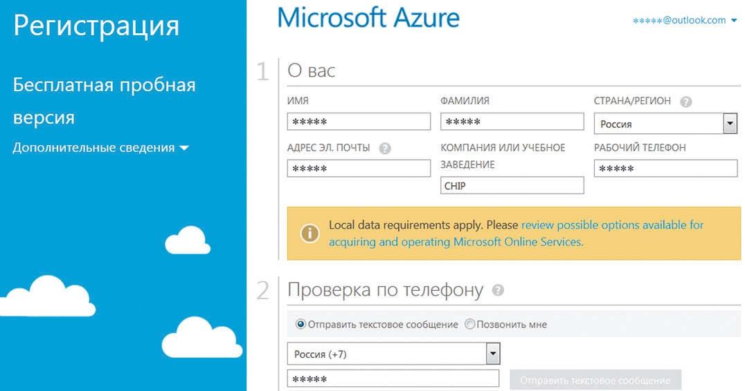 Откройте сайт azure.microsoft.com и пролистайте до конца страницы. Рядом с текстом «Hello from Seattle» поменяйте язык на «Русский», если он не определился автоматически. Теперь с помощью своей учетной записи Microsoft зарегистрируйтесь в службе, чтобы бесплатно опробовать ее возможности. Вы можете тестировать Azure в течение месяца.