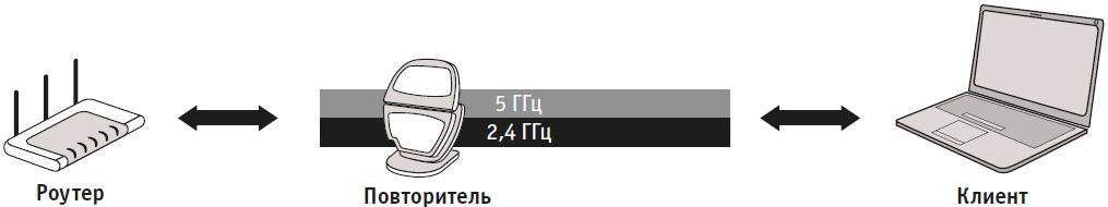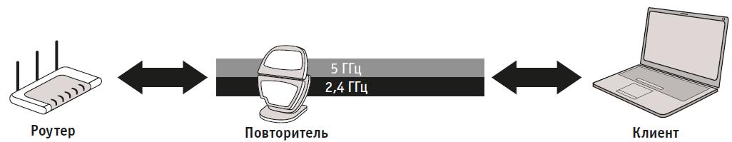 Same-band repeating — работа всех устройств в одном частотном диапазоне. В этом режиме скорость передачи потока данных сокращается вдвое.