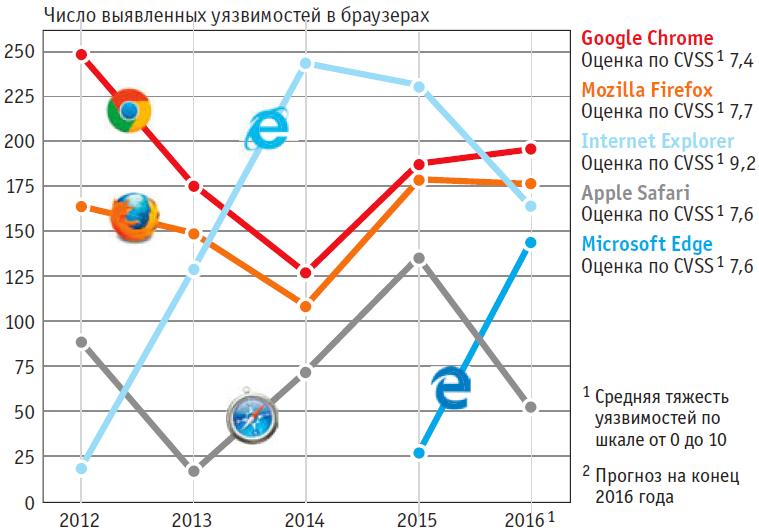 В качестве альтернативы IE компания Microsoft исключительно в свою «десятку» внедрила новый браузер Edge, который с точки зрения безопасности выгодно отличился. До сих пор для него не было обнаружено ни одного эксплойта нулевого дня, и пока известно лишь только об одной уязвимости, которая, впрочем, не была использована до последующего дня патчей. По сравнению с IE, средняя степень тяжести уязвимостей Edge гораздо ниже (см. выше слева). Однако, несмотря на все это, позиция нового браузера в системе оценки Common Vulnerability Scoring System (CVSS) ниже Chrome и примерно на том же уровне, что и Safari и Firefox. CVSS оценивает опасность каждой «прорехи» по шкале от 0 до 10 баллов, где 10 означает максимальный уровень угрозы.