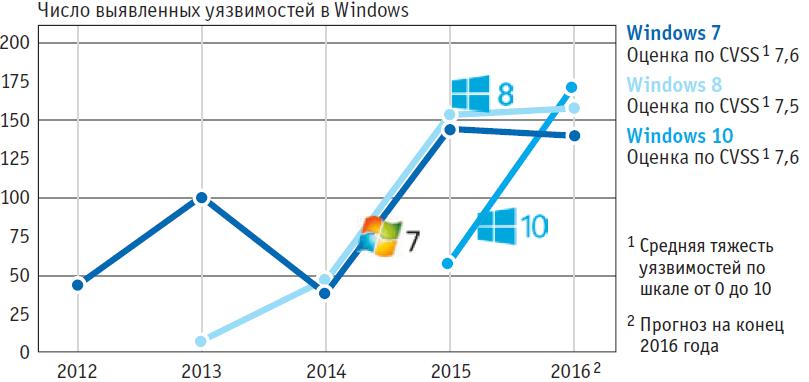 Корпорация Microsoft заявляет, что с каждой новой версией Windows становится чуть более надежной. Но на практике концерн интегрировал в «десятку» столько же функций обеспечения безопасности, сколько и в любую другую версию. Если же посмотреть на количество и тяжесть обнаруженных за последние годы уязвимостей (см. выше), необходимо признать, что принятые меры мало чем помогли, а если совсем честно, не помогли совсем. Так, в первый же год существования Windows 10 компания Microsoft доложила о том, что в новой операционной системе было выявлено больше прорех, чем в версиях 7 и 8 за тот же период времени. На данный момент система CVE (Common Vulnerabilities and Exposures — типовые уязвимости и ошибки конфигурации) перечисляет больше уязвимостей для Windows 10, чем для ее предшественниц. В целом, в нынешнем году можно ожидать небывалых показателей количества уязвимостей.