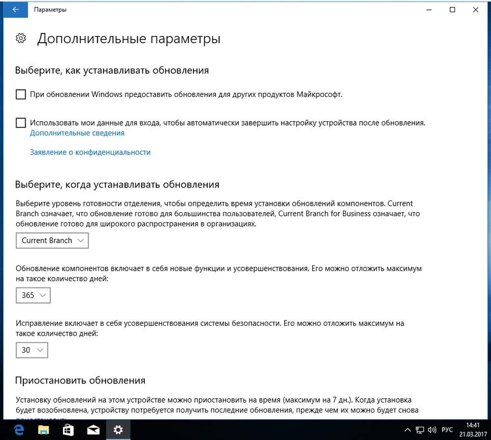 Другое усовершенствование: благодаря Creators Update пользователи систем Windows 10 «Профессиональная», «Корпоративная» и «Учебная» смогут отложить грядущее обновление. Прежде это было доступно лишь для крупных обновлений функций, теперь же позволено блокировать любые апдейты на срок до 30 дней — кроме предусмотренных корпорацией исключений. Антивирус Защитник Windows, к примеру, должен обновляться постоянно. Таким образом, для него обновления отложить на длительный срок невозможно. Если же отправить апдейты в очередь ожидания, Центр обновления Windows будет давать о себе знать каждый раз, прежде чем вы сможете снова выставить защиту. У пользователей Windows 10 «Домашняя» даже с Creators Update не получится заблокировать обновления.