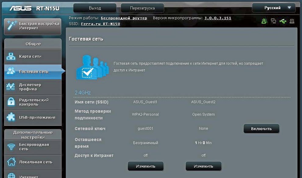 Гостевой доступ для сетей 2,4 и 5 ГГц активируется на стартовой странице в меню «Гостевая сеть». Для параметра «Метод проверки подлинности» установите «WPA2-Personal» с надежным паролем. Если сеть обязательно должна быть открытой, ограничьте время доступа для пользователей, например, одним часом и пропускной способностью 1 Мбит/с.