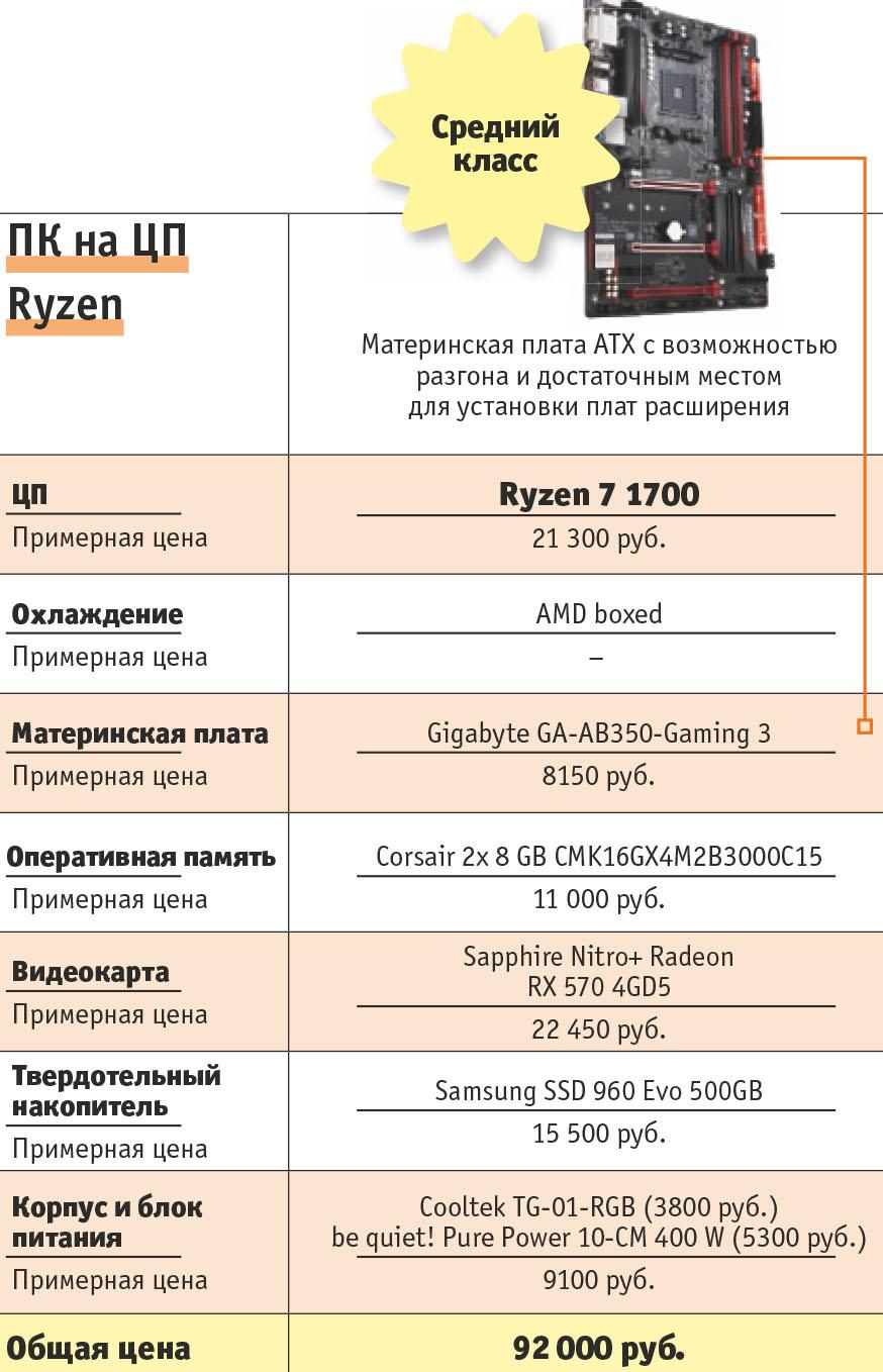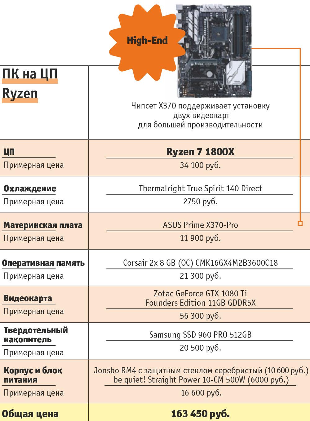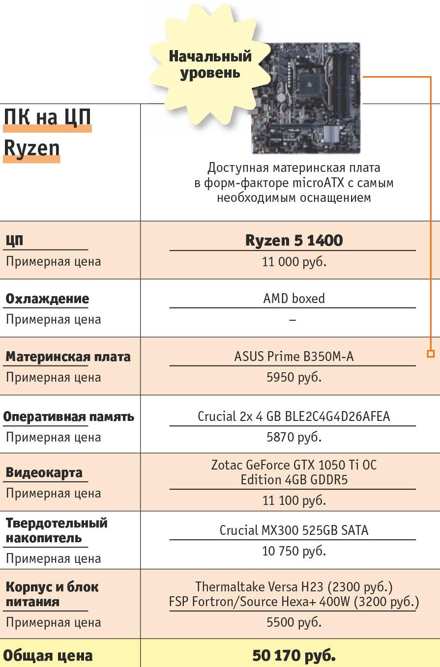Процессоры Ryzen от AMD навели панику на могущественного, казалось бы, конкурента Intel, который отреагировал снижением цен и выпуском чипов на архитектуре Skylake-X. Однако конкурировать с решениями от Ryzen все еще сложно, ведь они по-прежнему предлагают высокую вычислительную мощность по более доступной цене. Более того, все процессоры Ryzen легко можно разогнать — Intel же свои CPU, кроме топовых моделей, защищает от повышения тактовой частоты. Мы расскажем, как выбрать нужный процессор Ryzen и подобрать к нему компоненты. Предложенные варианты в таблице на следующей странице можно легко модернизировать: комбинацию «ЦП — система охлаждения — материнская плата — оперативная память» мы рекомендуем оставить без изменений, а остальные части можно заменить, в том числе на уже имеющиеся у вас.