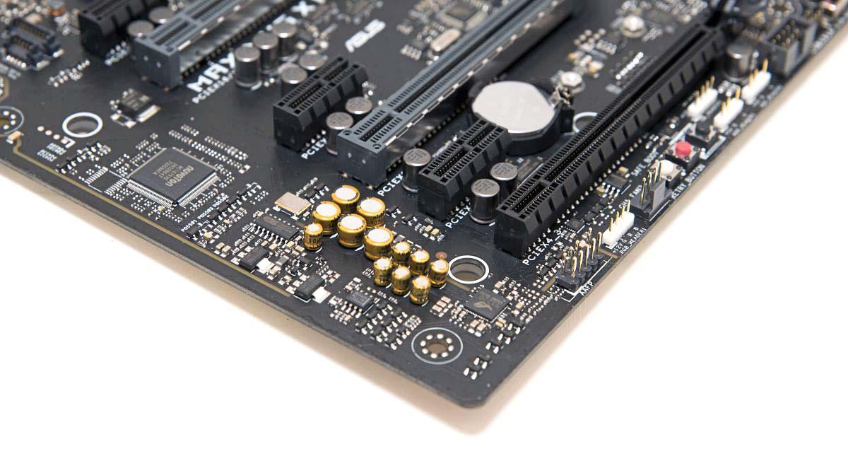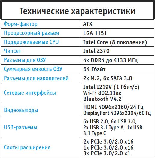 Чипсет Intel Z370 совместим с процессорами восьмого поколения. Часть линий PCIe находятся в них, а часть в PCH (старое название — южный мост). Процессорные линии плата распределяет между двумя слотами PCIe в режиме 16х+0х, или 8х+8х. Таким образом, задействованы все 16 линий от процессора. Далее распределение зависит от установленного оборудования. Верхний слот PCIe и последний связаны между собой. На выбор предлагается схема, при которой работают оба слота со скоростью 1х+2х или только нижний в позиции 4х.