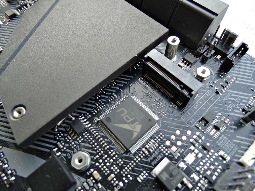 Подсистема питания построена на базе контроллера Digi+ ASP1405I, насчитывает восемь фаз и оснащается небольшим алюминиевым радиатором, который устанавливается прямо на мосфеты через термопрокладку. Радиатор чипсета составной и позволяет установить под себя накопитель NVMe.