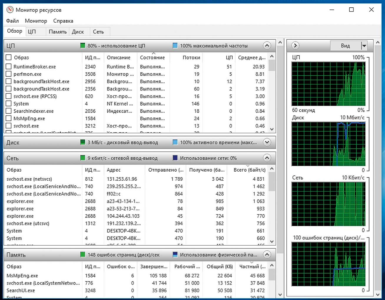 Если Windows реагирует на ваши действия крайне медленно, вполне вероятно, что она вплотную занята какой-то задачей. Зайдите в «Монитор ресурсов», который вы найдете через поиск по слову «resmon». Сверху вы увидите вкладку с подробной информацией о CPU, оперативной памяти, дисках и сети. В разделе «Диск» нажмите на «Работу диска» и заголовок столбца «Всего (байт/сек.)». После этого наверху отобразятся процессы, сильнее всего нагружающие жесткий диск.