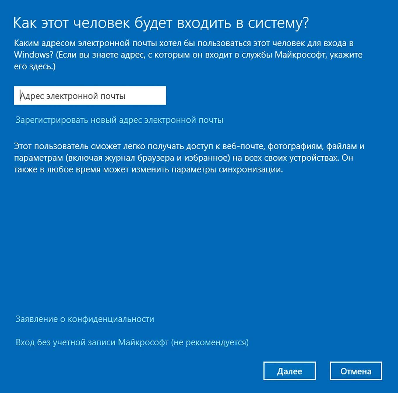 Начиная с Windows 8, корпорация при установке убеждает пользователя войти в систему посредством аккаунта Microsoft. Обычного пользователя это застает врасплох, поскольку он сначала видит поля для ввода логина и пароля, а также указание для тех, кто забыл свой пароль. Тем, у кого еще нет такой учетной записи, предлагается ее создать. В самом низу мелким шрифтом в Windows 10 спрятана опция для работы с локальной учетной записью. Нажмите на строчку «Пропустить этот шаг» и создайте обычный аккаунт для компьютера. Даже если вы зарегистрировали учетную запись Microsoft под Windows 10, для входа в систему вполне можно использовать локальную. Для этого в «Параметрах» зайдите в пункт «Учетные записи». В разделе «Ваша учетная запись» нажмите на «Войти вместо этого с локальной учетной записью».