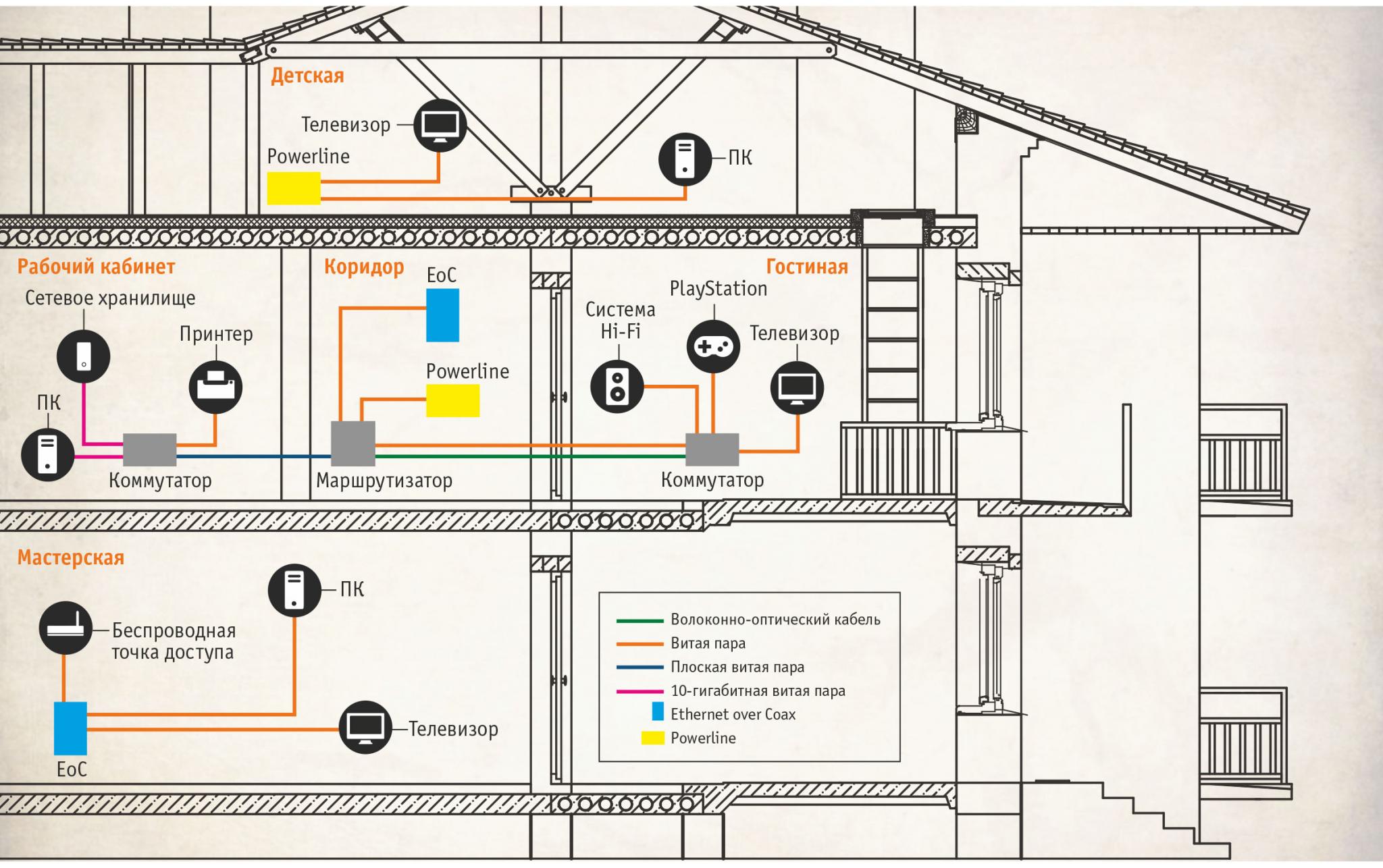 Самое оптимальное и универсальное решение — кабель Ethernet с сетевыми разъемами, проложенный под штукатуркой во всех комнатах, — обычно принимается в расчет только в случае новостроек или капремонта. Мы ограничились неинвазивными вариантами, и тем не менее много вопросов предстояло решить: какие нужны кабели, где и какие альтернативы витой паре лучше использовать, как работают сетевые коммутаторы (свитчи) и на что следует обратить внимание при покупке?
