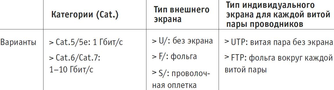 Параметр, следующий за категорией в названии, обозначает тип конструкции кабеля. Например, надпись «U/UTP» означает, что экранирования нет — ни внешнего общего (U/), ни индивидуального для каждой витой пары (UTP — Unshielded Twisted Pair, витая пара без экрана). Надпись «S/FTP», наоборот, означает, что кабель снаружи оплетен проволокой (S/), а все витые пары по отдельности защищены фольгой (FTP). Неэкранированные кабели тоньше, но не следует их слишком перегибать, иначе изломы могут привести к резкому падению скорости или ошибкам соединения. Лучше всего такие кабели подходят для преодоления последних метров от свитча до клиентского устройства. Чем большее расстояние предстоит преодолеть и чем больше устройств будет подключено по кабелю, тем лучше должна быть защита сигнала от помех — хотя бы только для того, чтобы снизить вероятность возникновения проблем в будущем.