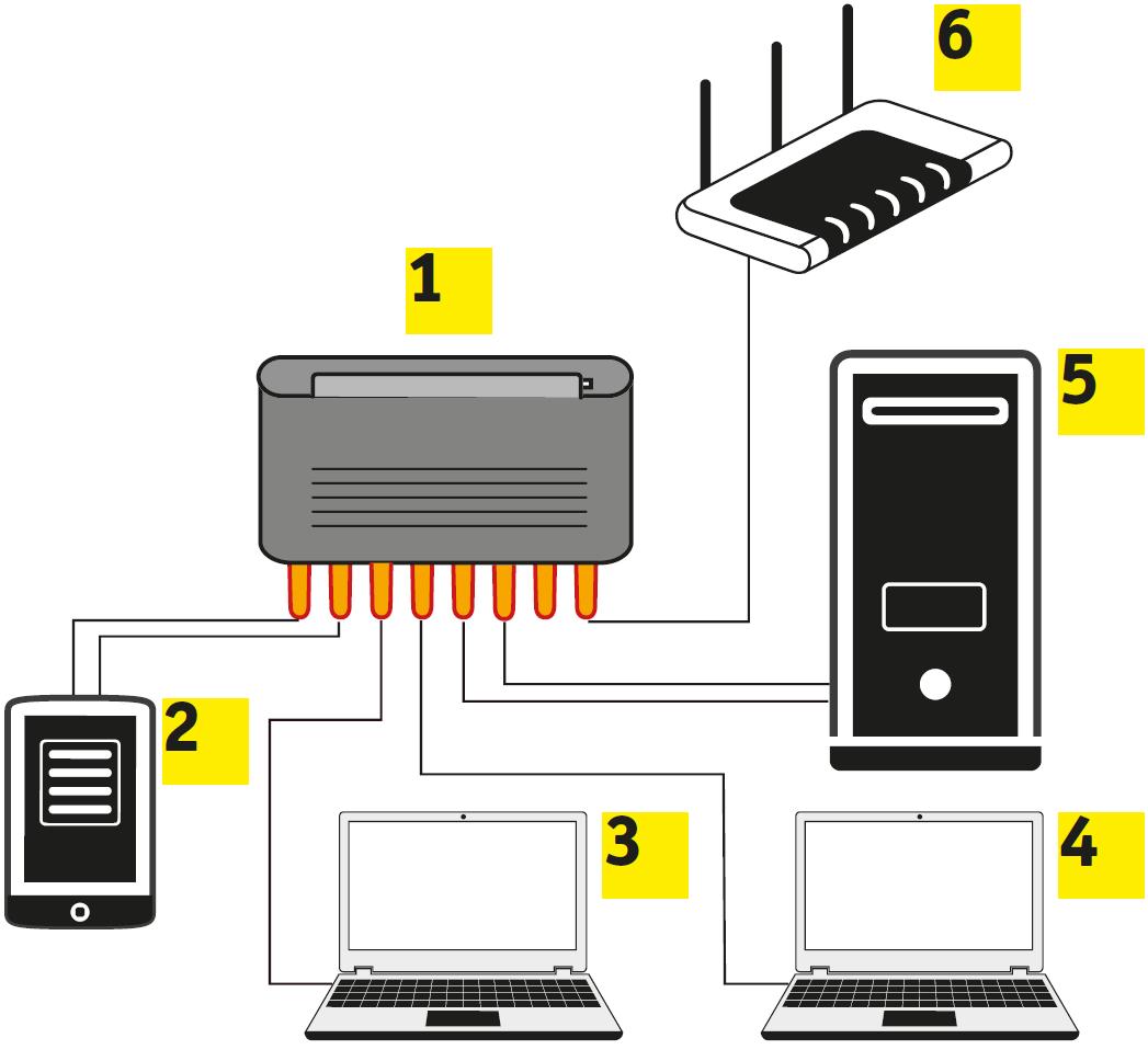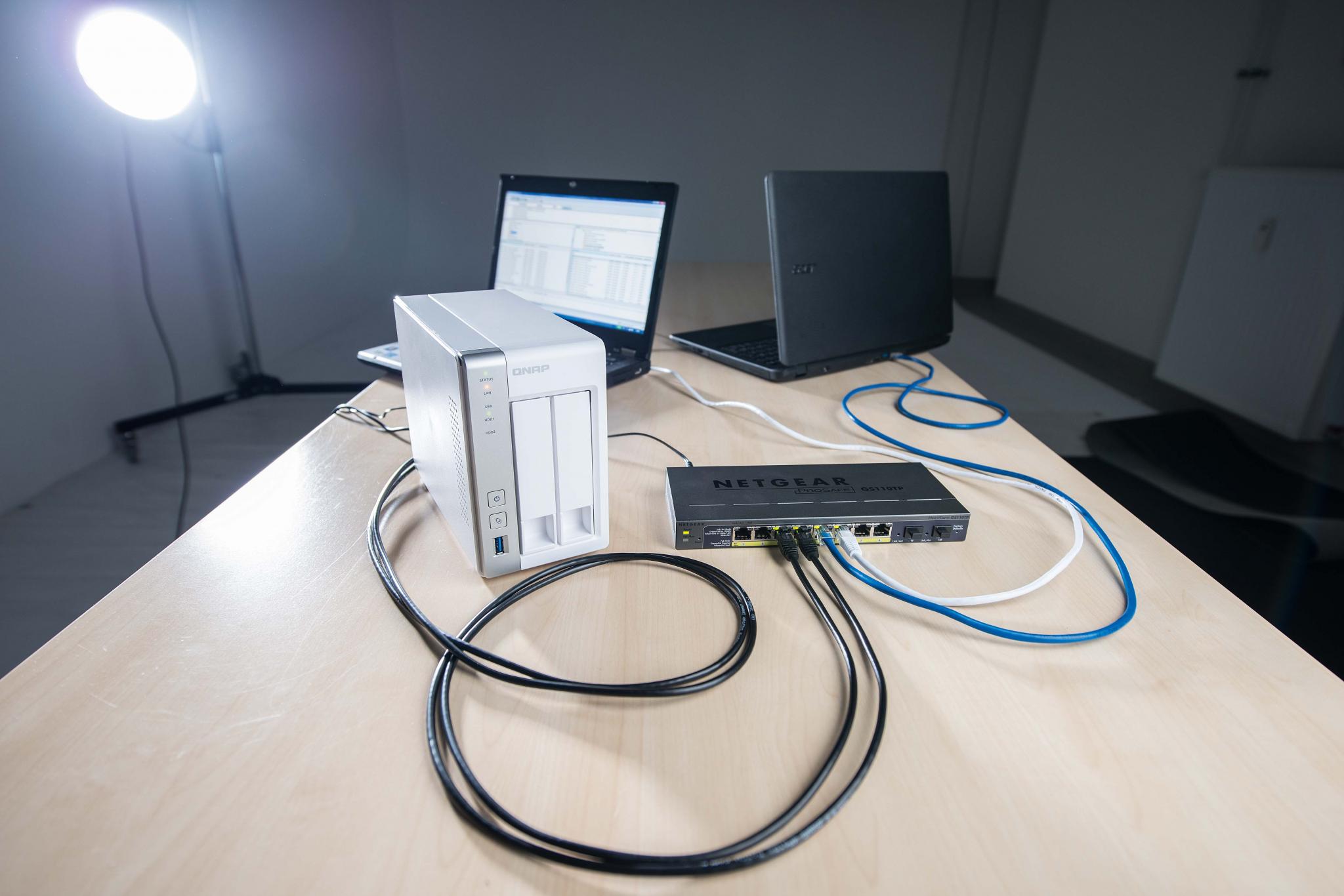 Коммутатор с функцией управления 1 соединяет все остальные устройства. NAS-накопитель 2 подключается к коммутатору с помощью двух LAN-кабелей путем агрегации каналов и в ходе нашего первого тестового сценария может одновременно обеспечивать скорость 1 Гбит/с для двух ноутбуков ( 3 и 4 ).