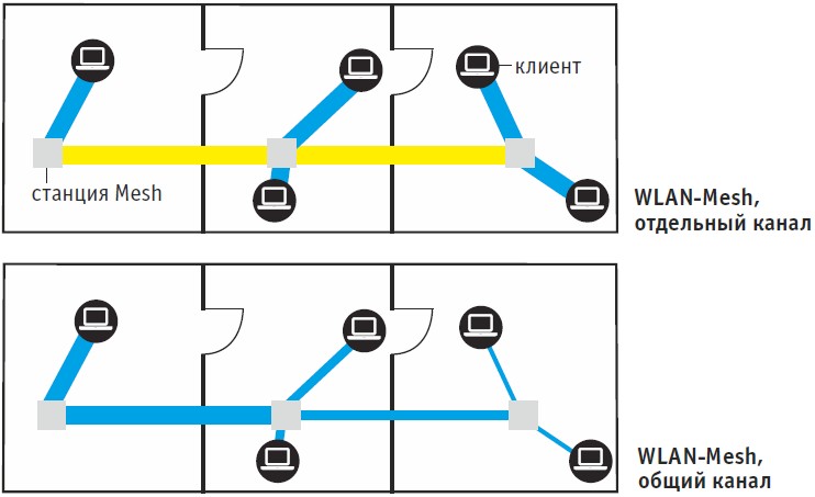 В «настоящих» Mesh-системах каждая станция может передавать сигнал по трем каналам: одному в диапазоне 2,4 ГГц, а также двум каналам в диапазоне 5 ГГц. Один из каналов в диапазоне 5 ГГц — это Backhaul-WLAN-сеть, соединяющая друг с другом Mesh-станции, но невидимая для обычных клиентов. Крупное устройство Netgear Orbi обеспечивает номинальную пропускную способность в 1,7 Гбит/с. Клиенты подключаются ко второму каналу в диапазоне 5 ГГц или к ближайшей станции по каналу в диапазоне 2,4 ГГц. Поскольку это требует использования сложных технологий в каждом устройстве, такие Mesh-системы являются наиболее дорогими. В нашем тестовом помещении (см. таблицу на стр. 39) это относится к системам Netgear Orbi, ASUS Lyra Triband и Linksys Velop.
