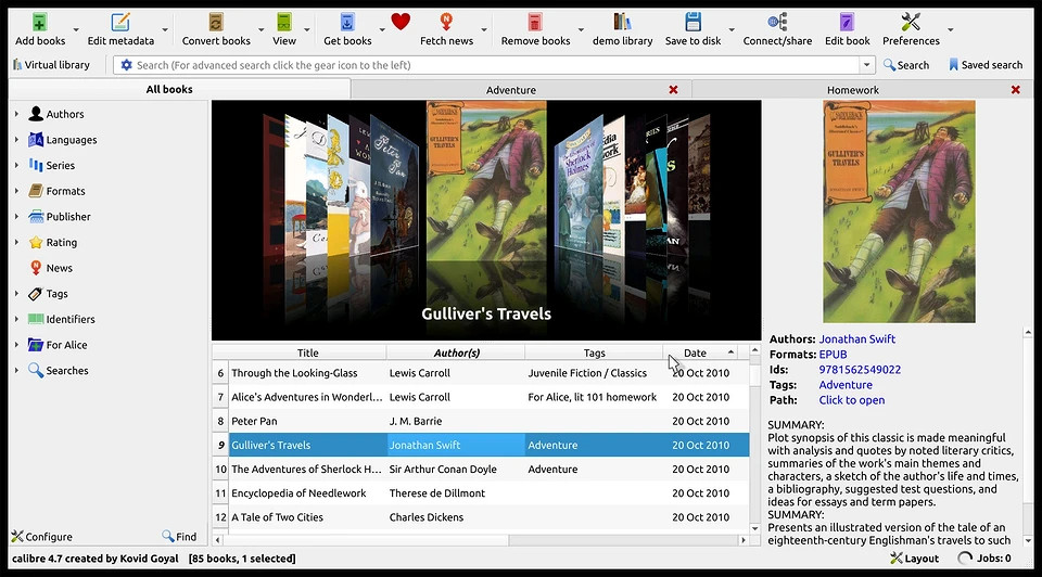 В базе данных программы хранится вся необходимая информация о книге, включая ее оценку и дату выхода, с возможностью поиска и сортировки по ней, а встроенный набор функций на Python может быть расширен самостоятельно. При этом софт поддерживает многочисленные плагины и может преобразовывать в книгу ленты новостей с некоторых сайтов.