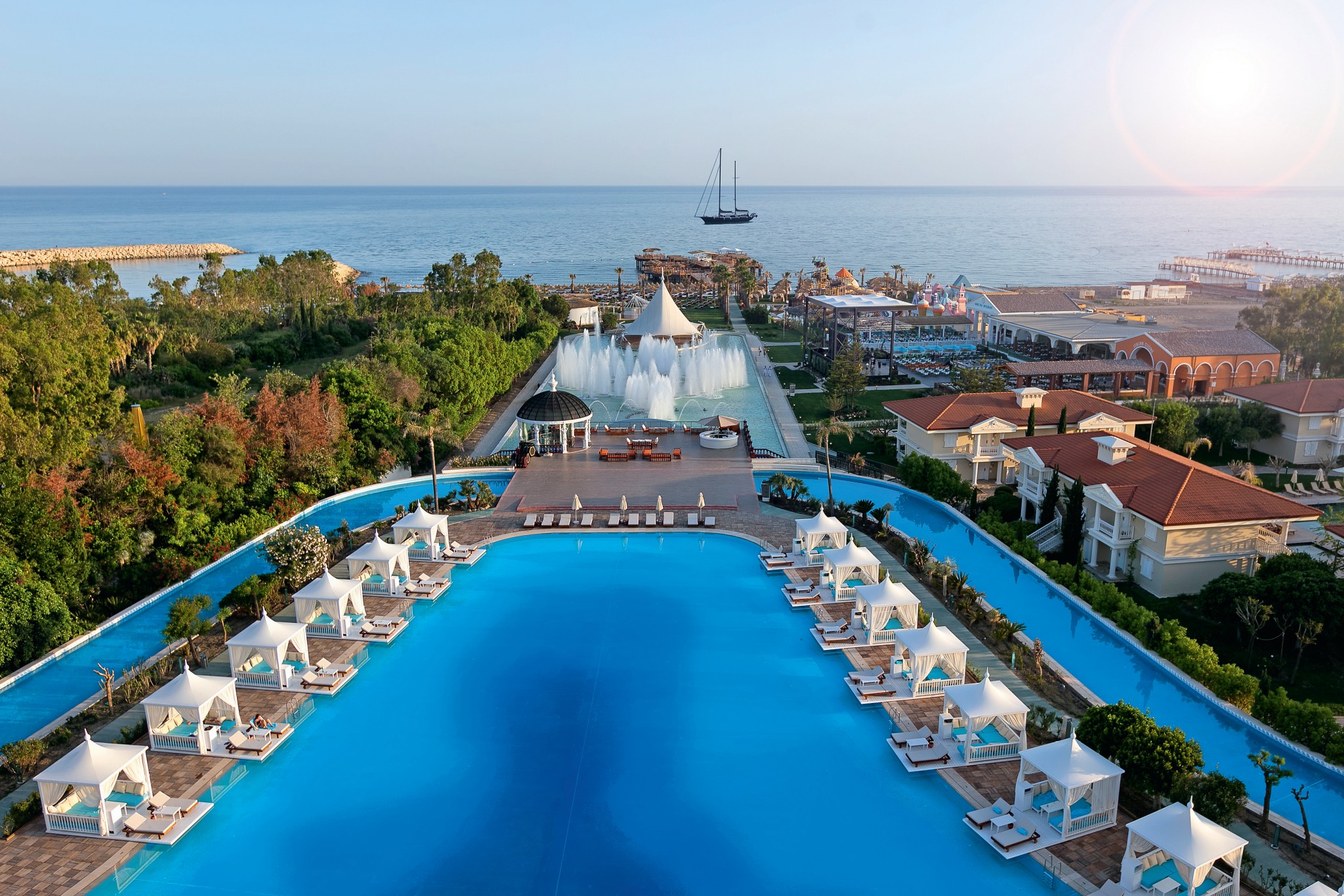 Во-первых, отель впечатлит тебя масштабом. Мы многое видели, но это правда поражает. Стоящий на берегу Средиземного моря комплекс похож на отдельный город, причем очень богатый! Центральная аллея, которая ведет к главному зданию, напоминает Петергоф: фонтаны, статуи и позолота. Само здание – настоящий дворец: мрамор, дорогие ткани, лепнина и потрясающие люстры. Повсюду висят картины – ты найдешь их даже в ванной комнате стандартного номера.