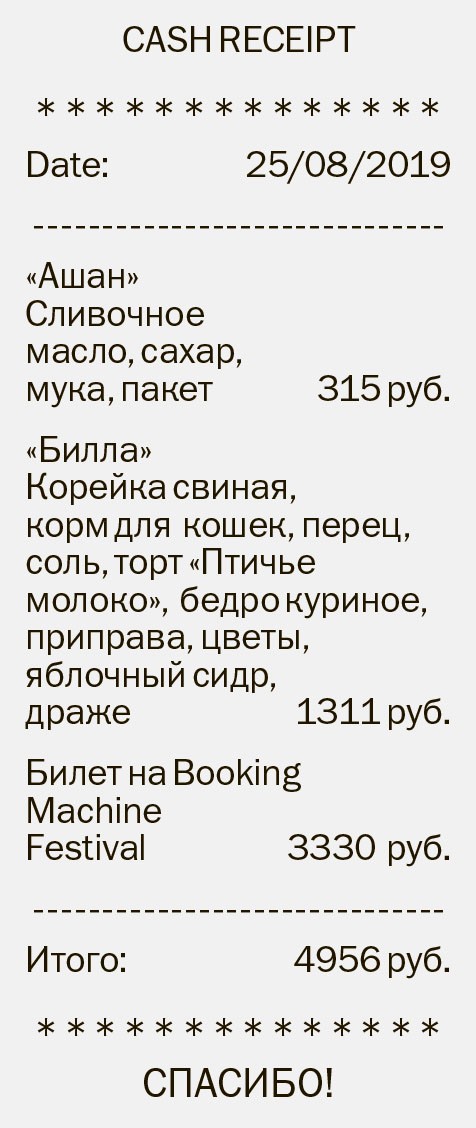 Евгения Блискавка: «Тут всё вроде бы умеренно. Но в чеке не учтены траты на еду на фестивале. Это одна из ловушек бюджета – статьи на случайные, неучтенные, позабытые расходы могут значительно преобразить картину отношений с деньгами. И вот, казалось бы, безобидные мелочи начинают проедать наш финансовый потенциал. Чтобы присматривать за бюджетом регулярно, процесс должен быть удобен – используй мобильные приложения банков».