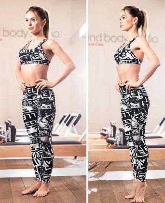 Исходное положение: пятки вместе, носки чуть врозь, смотреть перед собой. Плотно сжимая бедра, поднимись на цыпочки. Живот втянут, грудь – вверх, а плечи расслаблены. Сделай пять повторений.