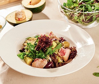 Салатные листья помой, высуши, произвольно нарви. Добавь нарезанный кубиками авокадо, обжаренный цукини.