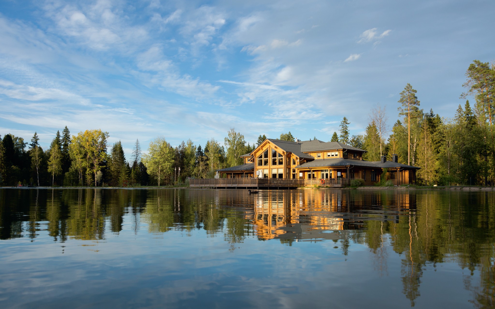 Откуда в названии отеля приставка «эко», становится ясно уже при въезде на территорию: на КПП вас попросят пересесть в симпатичный электрокар. Попетляв по узким дорожкам, проложенным в прямом смысле слова в лесу, он остановится возле выбранного бревенчатого коттеджа – вариантов несколько, и все очень симпатичные. Интерьер соответствует заявленной тематике: сплошные дерево, камень