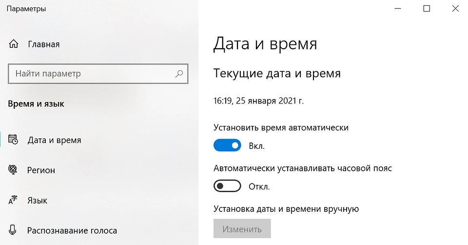 При установке Windows 10 система просит выбрать часовой пояс или устанавливает его по умолчанию. Возможно, в этот самый момент что-то пошло не так. Проверить текущие настройки просто - нажмите на часы в правом нижнем углу экрана правой кнопкой мыши и в возникшем окне выберите «Настройки даты и времени». Проще всего здесь сдвинуть ползунок "Установить время автоматически" вправо, включив таким образом функцию. Но можно и настроить корректное значение вручную.
