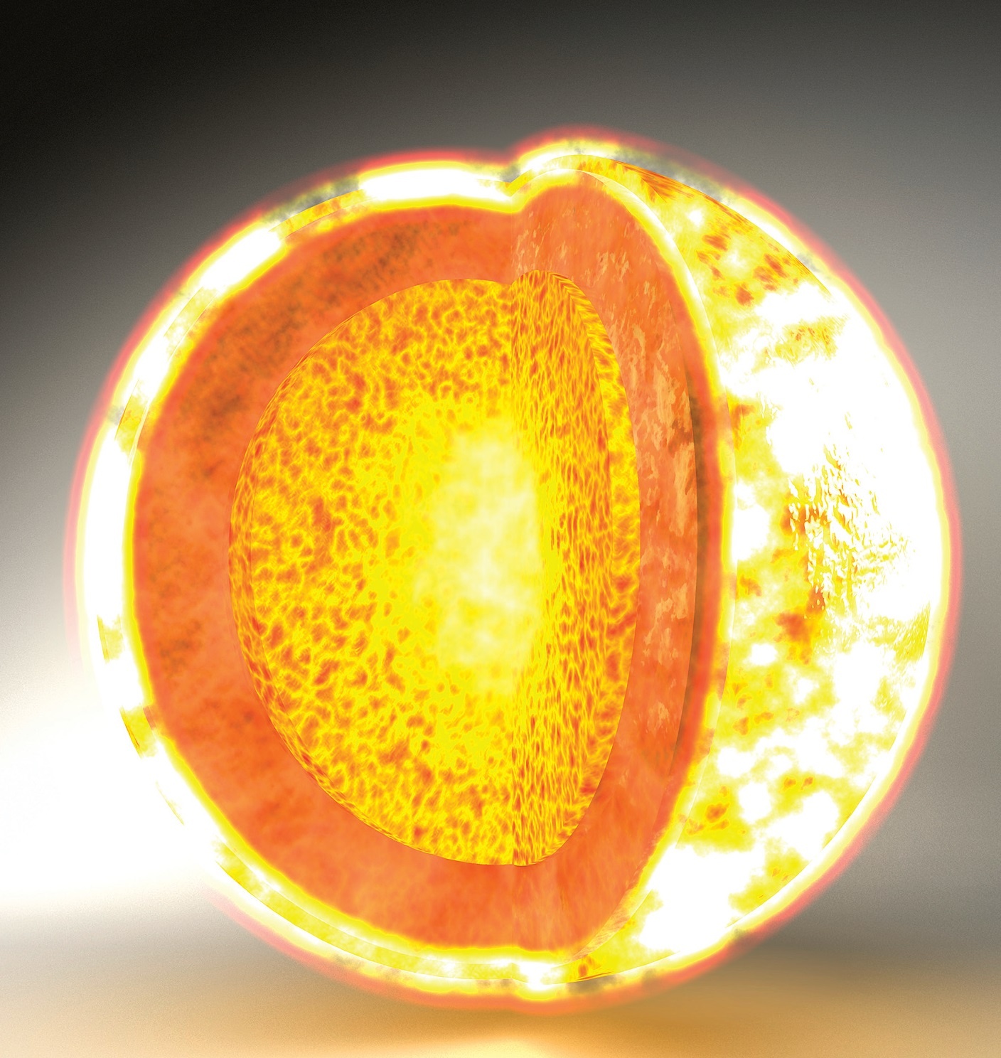 Слоистую структуру Солнца нередко сравнивают с луковицей. Эта аналогия не слишком удачна, поскольку сами слои пронизаны мощными вертикальными потоками вещества и энергии. Но в первом приближении она приемлема. Солнце светит за счет термоядерной энергии, которая генерируется в его ядре. Температура там достигает 15 млн градусов Цельсия, плотность — 160 г/см^3, давление — 3,4х1011 атм. В этих адских условиях осуществляется несколько цепочек термоядерных реакций, составляющих протон-протонный цикл (p-p-цикл). Этим именем он обязан начальной реакции, где два протона, столкнувшись, порождают ядро дейтерия, позитрон и электронное нейтрино.