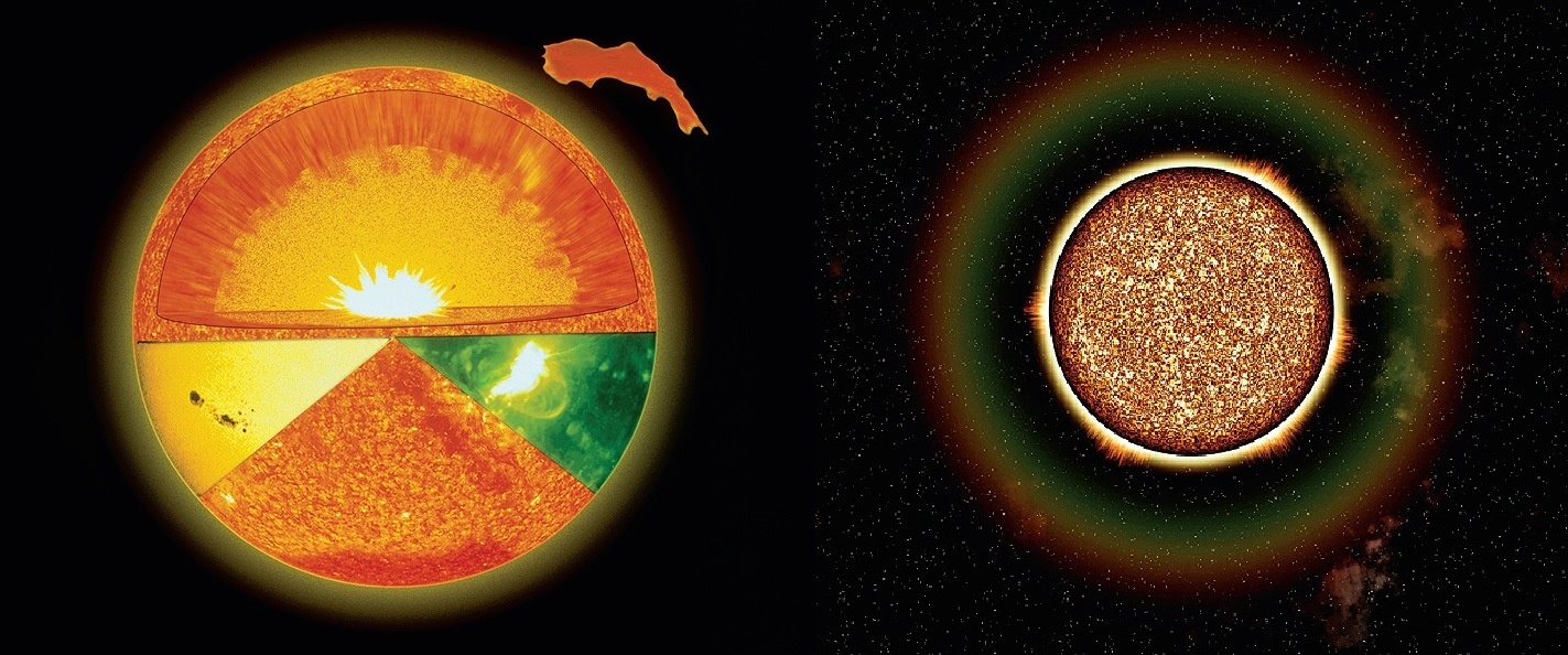 Вот кое-какие паспортные данные Солнца. Возраст — 4,59 млрд лет; масса — 1,989х1030 кг; средний радиус — 696 000 км; средняя плотность — 1,409 г/см^3 (плотность земной материи в четыре раза выше); эффективная температура поверхности (вычисленная в предположении, что Солнце излучает как абсолютно черное тело) — 5503˚С (в пересчете на абсолютную температуру — 5778 кельвинов); суммарная мощность излучения — 3,83х1023 кВт.