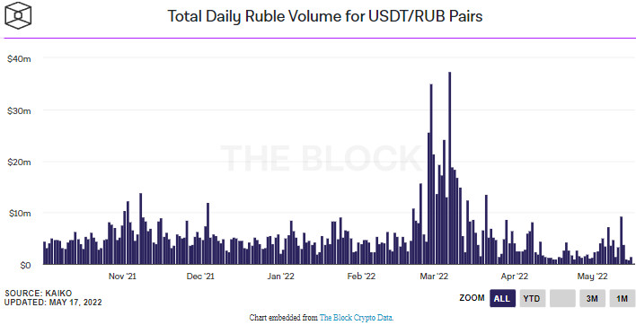 На этом фоне вырос интерес россиян к криптовалюте в целом и стейблкоинам (цифровым монетам, цена которых привязана к фиатной валюте, например к доллару) в частности. На интерес россиян к криптовалютам в конце марта обратила внимание даже глава Европейского центрального банка Кристин Лагард, которая указывала, что объем рублей, конвертированных в криптовалюты, — на самом высоком уровне с мая 2021 года. Участники рынка говорили о росте объемов операций россиян с криптовалютами, в основном со стейблкоинами, в несколько раз. По данным The Block, дневной объем торгов пары рубль-USDT (самый популярный стейблкоин) до начала «спецоперации»* России на Украине составлял примерно 3-5 млн в долларовом эквиваленте, в конце февраля начал расти и в пиковые дни в начале марта превышал $30 млн в день. Сейчас объем торгов вернулся к обычным значениям.
