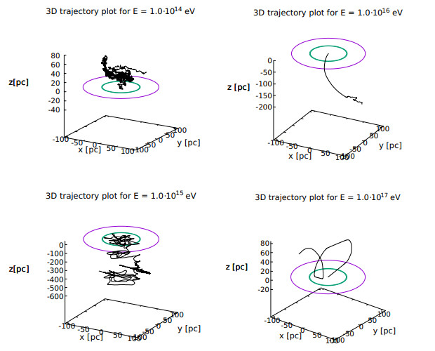 У этой галактической хватки, конечно, есть предел — чтобы сбежать, частице надо хорошенько разогнаться. Оценить, сможет ли заряженная частица покинуть галактику, можно по характерному радиусу кривизны ее траектории. Он прямо пропорционален импульсу частицы и обратно пропорционален ее заряду и величине магнитного поля — то есть чем быстрее движется частица и чем слабее удерживает ее поле, тем больше вероятность сорваться с привязи, на которой ее удерживает галактика. Если у частицы небольшая энергия, то магнитное поле галактики (порядка микрогаусса) будет удерживать ее внутри галактического диска, толщина которого — сотни парсек. Высокоэнергетические частицы, у которых радиус кривизны траектории значительно превосходит эту толщину, будут беспрепятственно ее покидать.