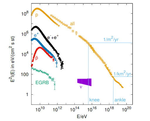 На том же спектре видно, что до «колена», в диапазоне энергий порядка 1010—1015 электронвольт, график очень плавный. А значит, все эти частицы ускоряются и распространяются в одних и тех же условиях: крайне маловероятно, что спектр совершенно разных источников случайно склеился в гладкую кривую.