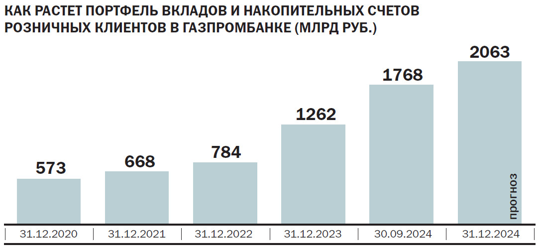 — Мы наблюдаем повышенный спрос на эти продукты: действительно, у нас сейчас опережающими рынок темпами растет портфель пассивов розничных клиентов. Если в прошлом году мы приросли более чем на 470 млрд руб., то этот год мы завершим с еще более впечатляющим результатом — 2024 год закроем ростом более чем 800 млрд руб., общий объем портфеля вкладов и накопительных счетов розничных клиентов превысит 2 трлн руб., не считая остатков на картах. Рост розничного портфеля пассивов составит 60% год к году, такого не было никогда.