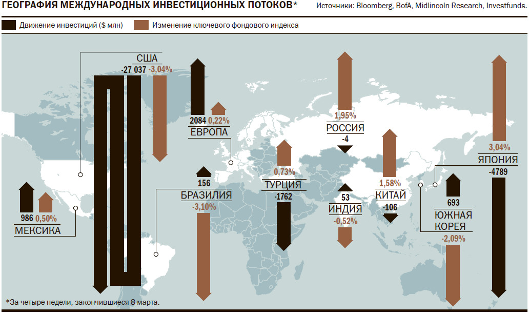 В минувшем месяце на американском фондовом рынке наблюдался сильнейший за десять месяцев отток инвестиций. По оценкам «Денег», основанным на данных отчетов Bank of America (BofA; учитывает данные Emerging Portfolio Fund Research; EPFR), за четыре недели, завершившиеся 8 марта, клиенты фондов, инвестиционная декларация которых ориентирована на рынки акций США, вывели из них свыше $27 млрд. Это более чем в четыре раза выше оттоков предшествующего месяца.