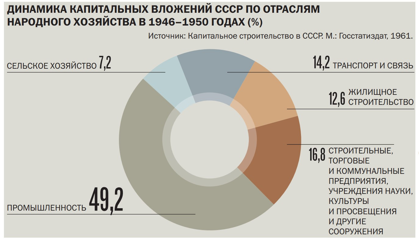 Восстановление и развитие промышленного потенциала требовало крупных капитальных затрат. За 1946–1950 годы они составили в сопоставимых ценах 17,164 млрд руб. Причем основная доля инвестиций приходилась на группу «А» (производство средств производства) — 87,9%.