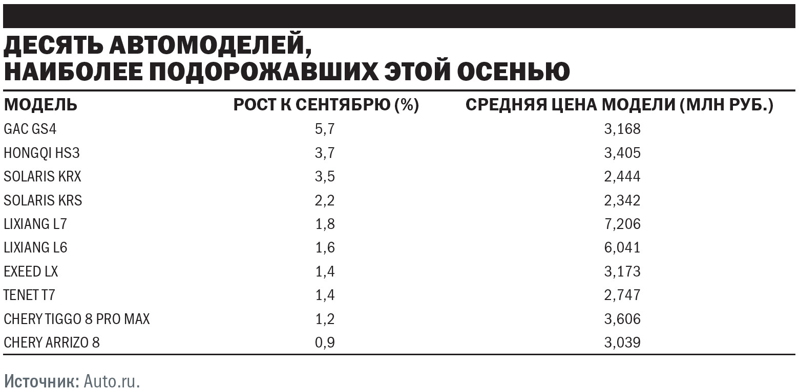 Вместе с большинством граждан летом отдыхали в России и цены на автомобили. Но, взяв передышку и набравшись сил, цены осенью вновь рванули вверх: по подсчетам «Автостата», средняя цена новой машины в России по итогам сентября достигла исторически рекордного уровня в 3,34 млн руб. Это на 4% выше, чем в августе, и на 6% — показателя сентября прошлого года. По данным Auto.ru, только за сентябрь текущего года на 5,7% подорожал среднеразмерный кроссовер GAC GS4 (теперь средняя цена этой модели составляет 3,168 млн руб.), на 3,7% вырос в цене кроссовер Hongqi HS3 (до 3,405 млн руб.), на 3,5% — хетчбэк Solaris KRX (до 2,444 млн руб.). Почти на полтора процента подскочили цены на Lixiang L7, EXEED LX и Tenet T7.