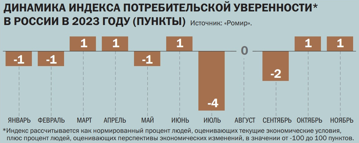 Настроение потребителей к концу 2023 года стабилизируется по сравнению с прошлым годом, следует из расчетов «Ромира». Индекс потребительской уверенности в октябре и ноябре оценивался в один пункт. В сентябре было минус два пункта, в июле — минус четыре. А в ноябре и декабре 2022 года потребительская уверенность оценивалась в минус восемь и минус семь пунктов соответственно. Как поясняют в «Ромире», индекс представляет собой нормированный процент людей, оценивающих текущие экономические условия («оптимисты» минус «пессимисты»), плюс процент людей, оценивающих перспективы экономических изменений («становится лучше» минус «ухудшается»).