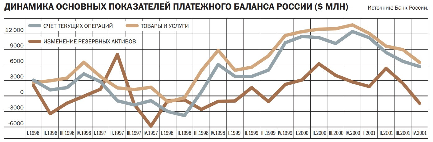 Однако относительно высокая стабильность рубля на фоне высокой по западным меркам инфляции и постоянного притока «инвестиционной» валюты в страну давала еще один эффект: рубль постепенно «дорожал» в реальном выражении. Это, как обычно бывает при укреплении национальной валюты, стимулировало импорт, а не внутреннее производство, поэтому начало снижаться положительное сальдо торгового баланса (разница между средствами, поступившими от экспорта и пошедшими на оплату импорта), а это, в свою очередь, снижало положительное сальдо счета текущих операций платежного баланса — разницы между пришедшими в страну валютными средствами и ушедшими из нее. К ушедшим средствам в данном случае относилась также и скупка наличной валюты гражданами, а это в 1997-м составляло в среднем более $1 млрд в месяц, поскольку в стране был экономический рост, а наученные опытом граждане предпочитали формировать сбережения в долларах.